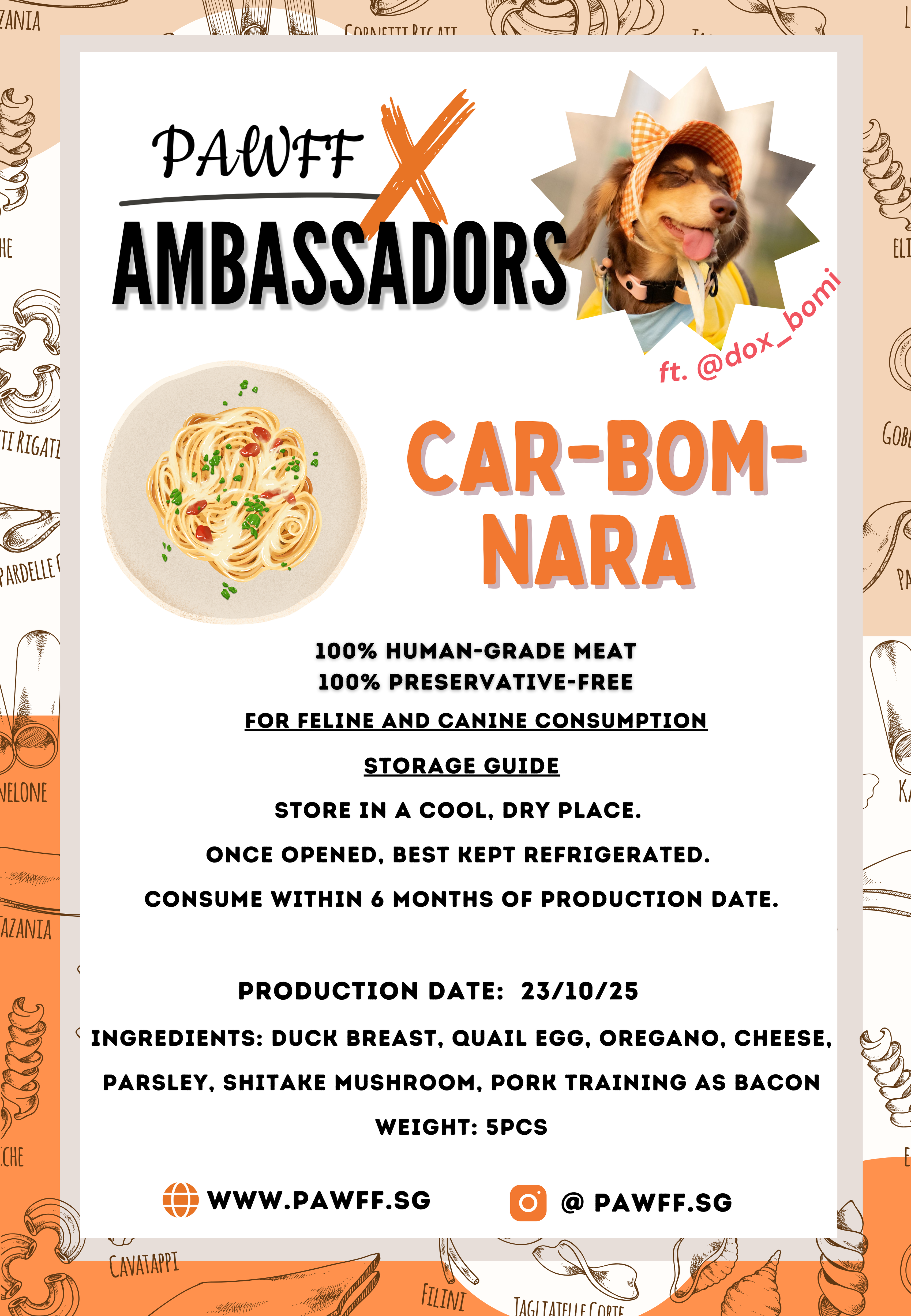 Carbomnara is Pawff’s festive twist on a classic comfort dish—crafted with juicy duck breast, rich quail egg, aromatic oregano & parsley, savoury shiitake mushrooms, cheesy goodness, and our irresistible pork “training-as-bacon” bites for that smoky, holiday indulgence.
